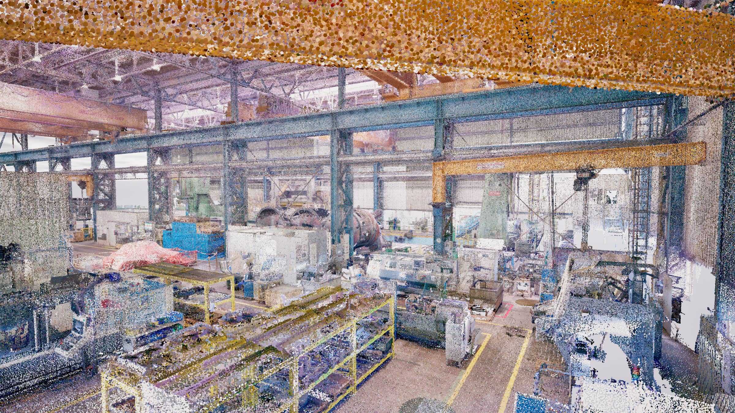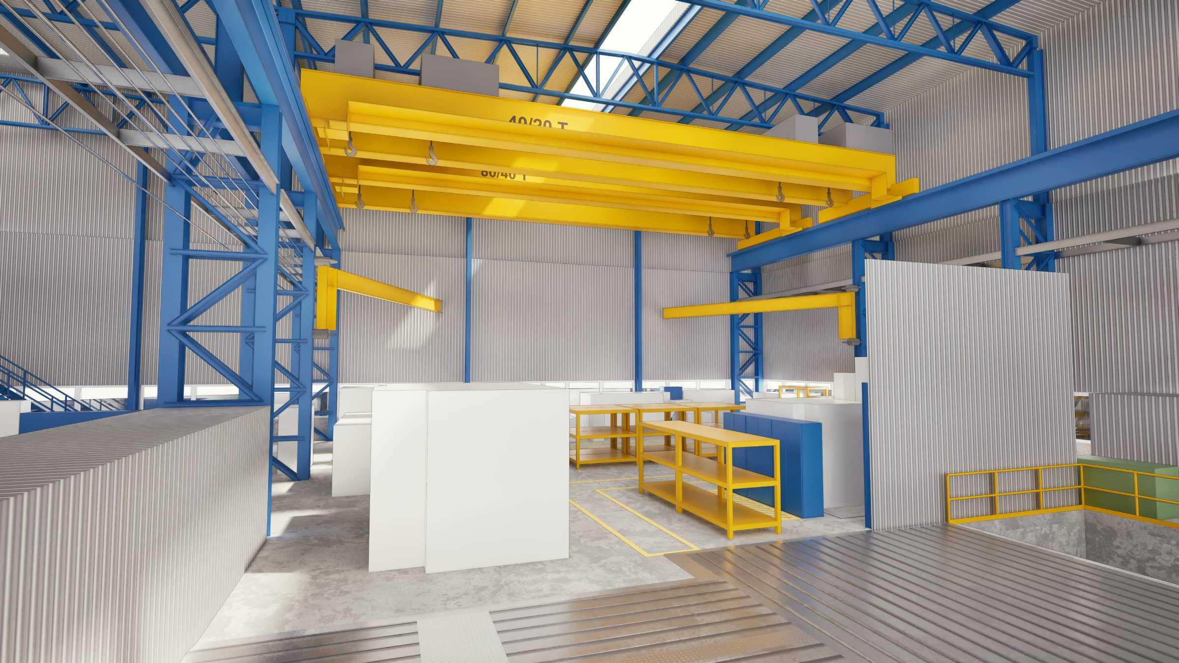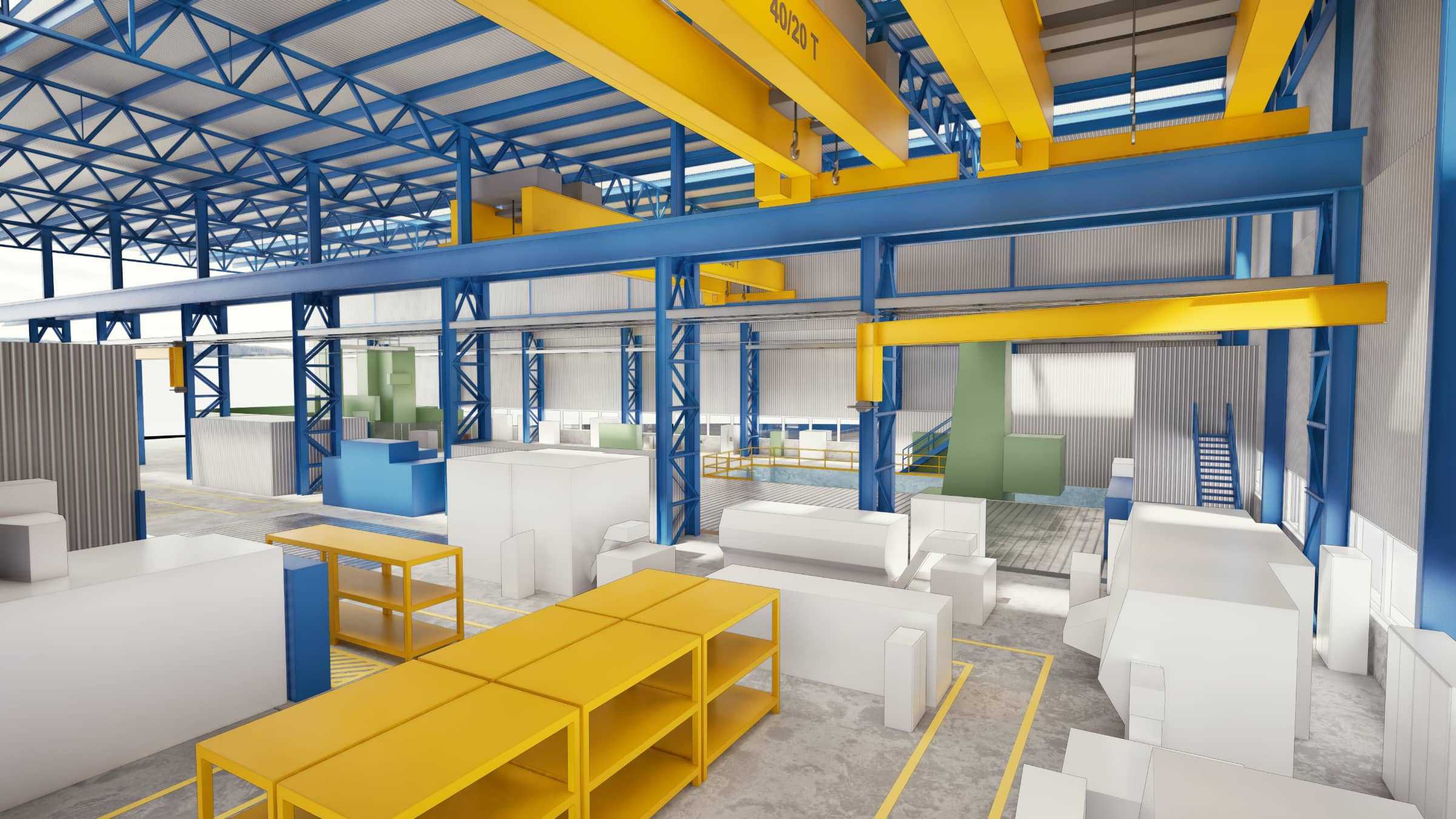 A szkennelt adatokból 3D modell készült, amely a csarnokszerkezetet, a darupályákat, a gépalapokat és a meglévő berendezések befoglaló méreteit is lekövette.