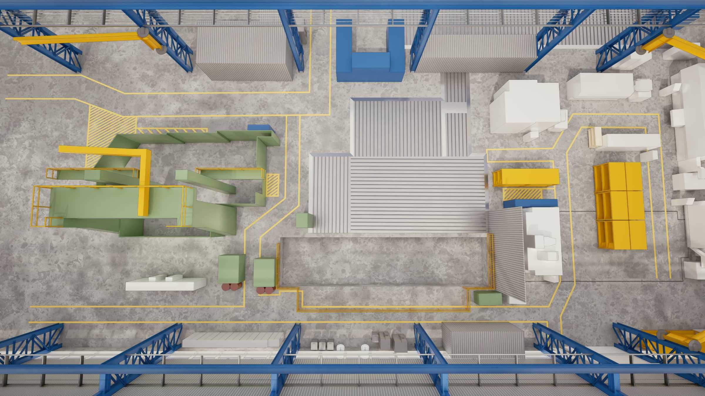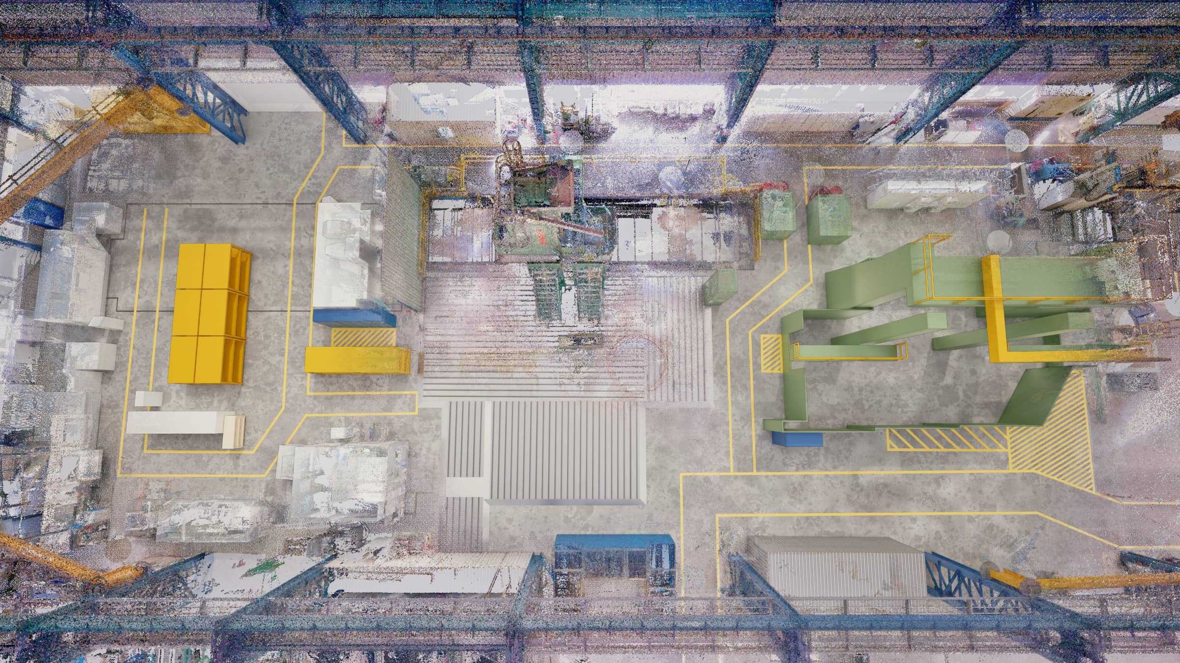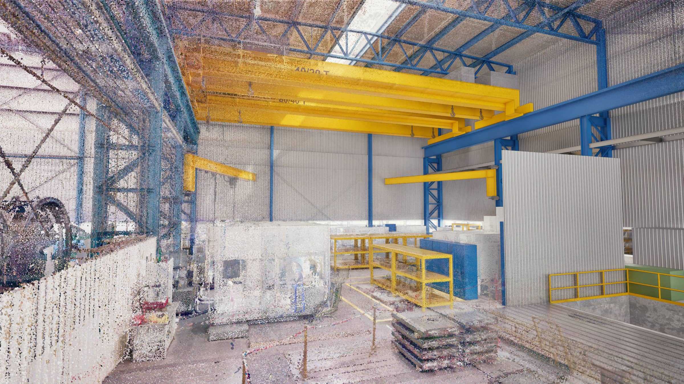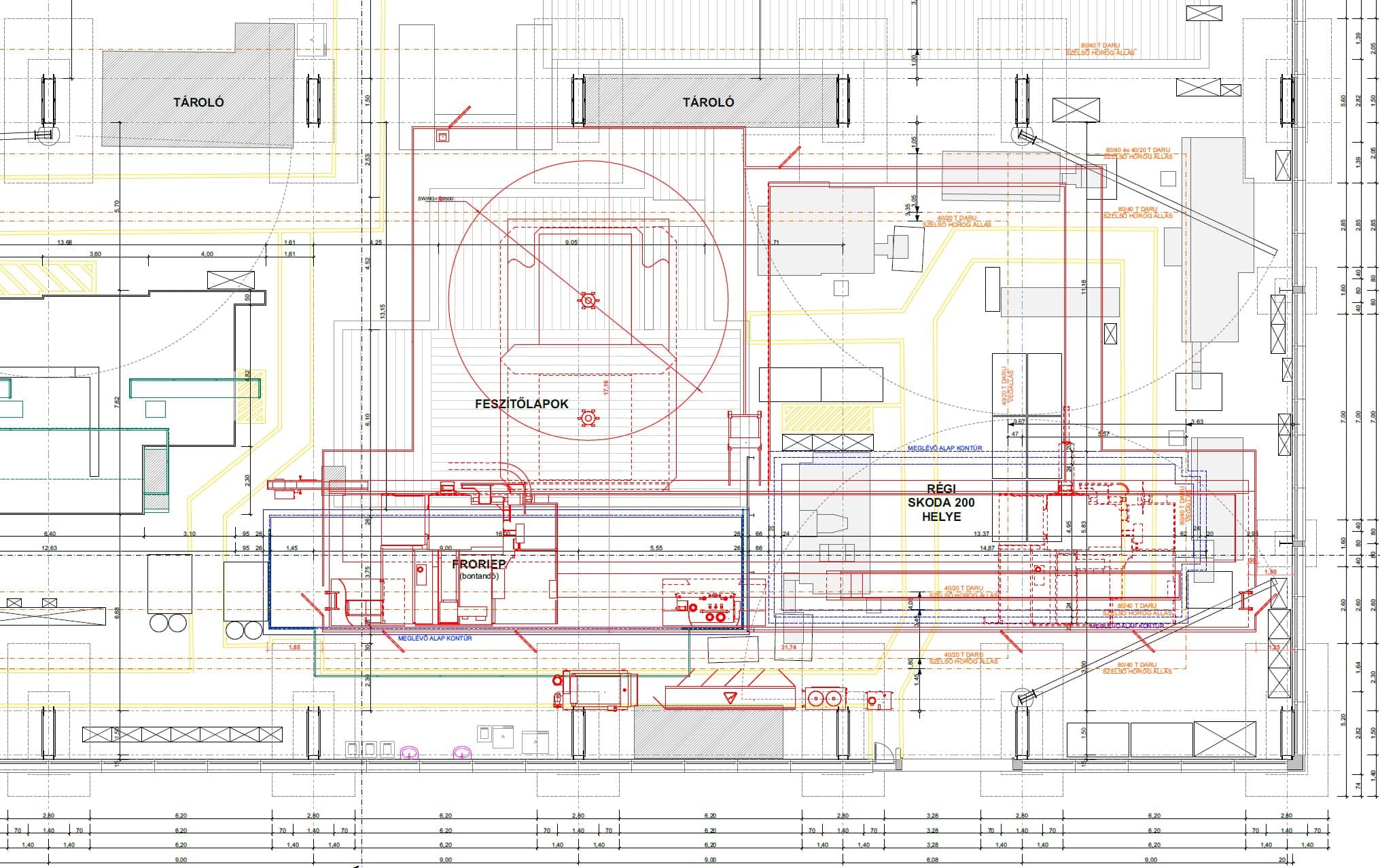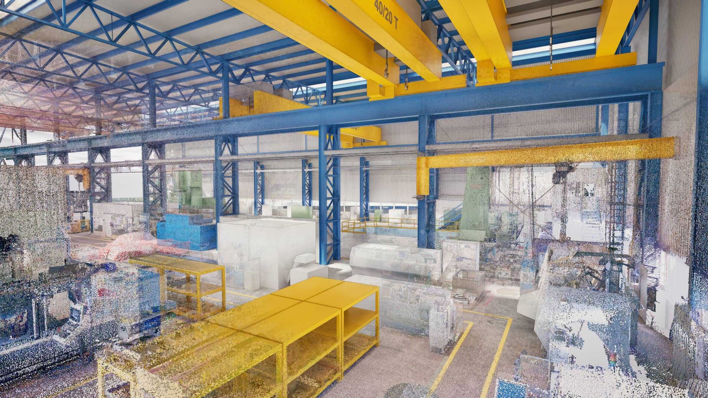 A meglévő berendezések, a régi gépalapok és a daruzási mozgástartományok precíz térbeli felmérésére volt szükség, annak érdekében, hogy az új gépek a lehető legoptimálisabban és ütközésmentesen legyenek elhelyezve.